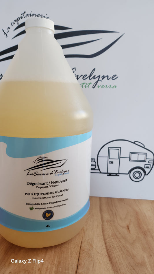 Savon multi-usage ,fabriqué au Québec, notre nettoyant, dégraissant est formulé, pour la coque de bateau et tout véhicules récréatif, il est conçu pour déloger les indésirables (cyanobactéries) et les saletés tenaces de votre surface. Notre formule est conçue à partir d'ingrédients naturels, biodégradables, sans parfums, ni phosphate, ce produit est efficace même en eau froide.